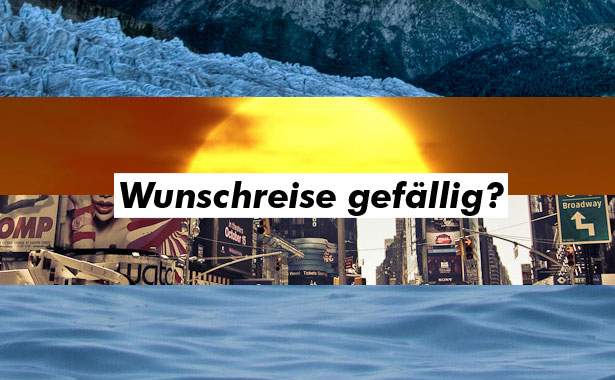 Von welchen Urlaub träumen Sie? Stellen Sie sich Ihre Wunschreise zusammen! Berge, Meer, See, Klettern, Surfen, Radsport? Schluß mit stundenlangen Suchen im Netz! Mit unserem Wunschfragebogen finden wir für Sie die maßgeschneiderte Reise. Nehmen Sie sich 5 Minuten Zeit und wir stellen Ihnen Ihre Wunschreise zusammen. |